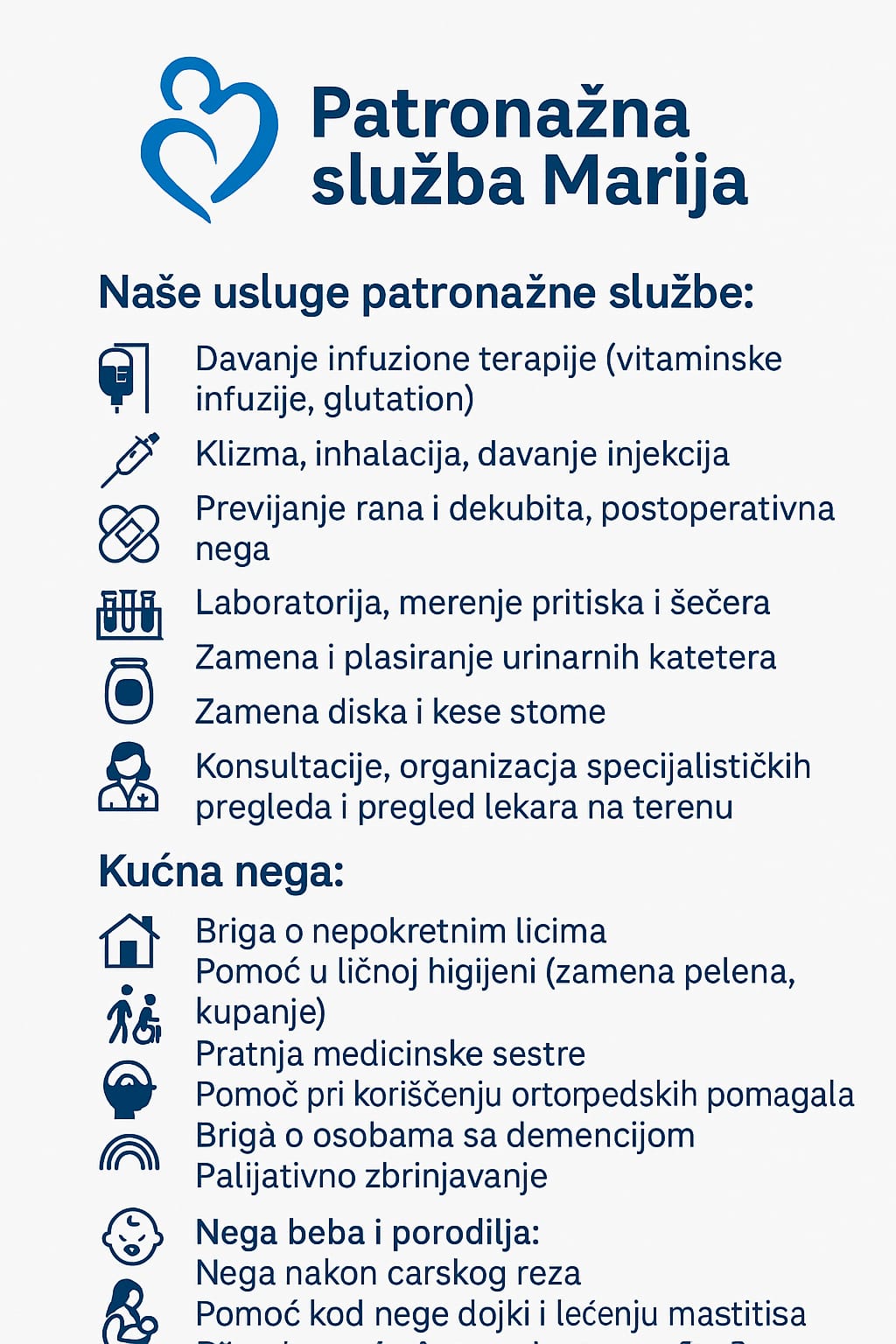 Možete dobiti injekcije i infuzije, previjanje rana, kontrolu pritiska i šećera, pomoć porodiljama i bebama, postoperativnu negu, plasiranje katetera, negu stome, kao i laboratorijske analize na kućnoj adresi.